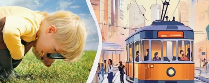Billedet viser en travl gade med mennesker, der går langs den, og en almindelig sporvogn, der kører. Du skal sætte en timer til fem sekunder og nå at finde fejlen, inden tiden løber ud. Er du klar?